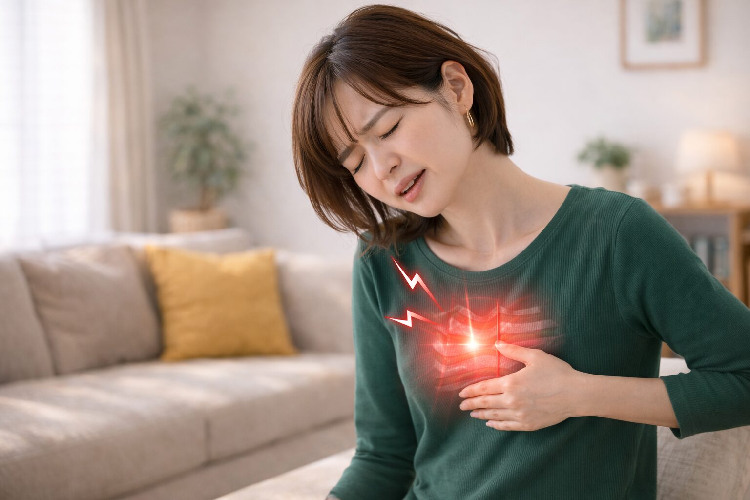胸の横やわき腹あたりに、ズキッと電気が走るような痛み。