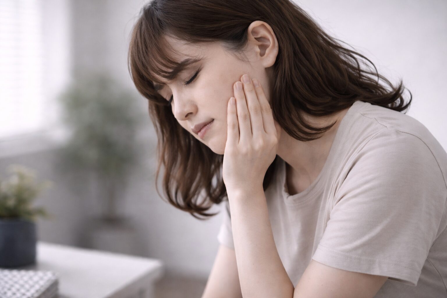 噛みしめ・食いしばりが続くと、こめかみの張りや頭痛、首こり・肩こりまで重なり、朝から一日が重く感じやすくなります。